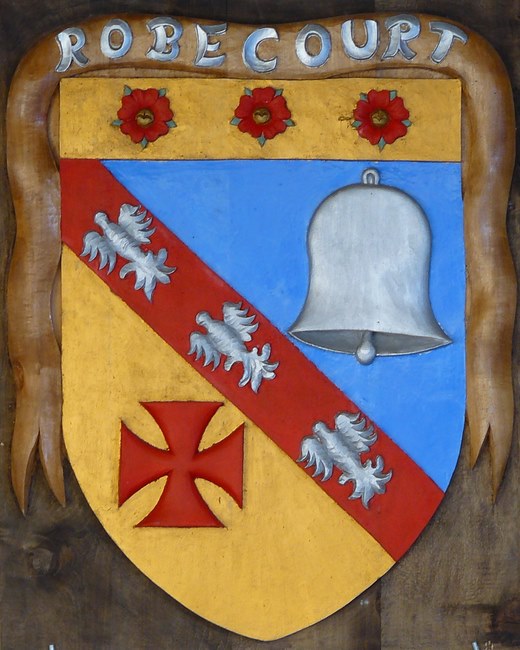 "Tranché d'azur à la cloche d'argent, et d'or à la croix pattée de gueules, à la bande du même chargée de trois alérions d'argent, au chef d'or chargé de trois roses de gueules."