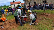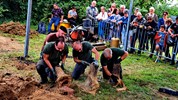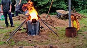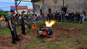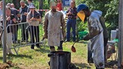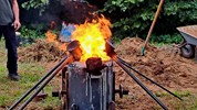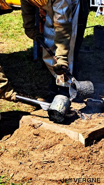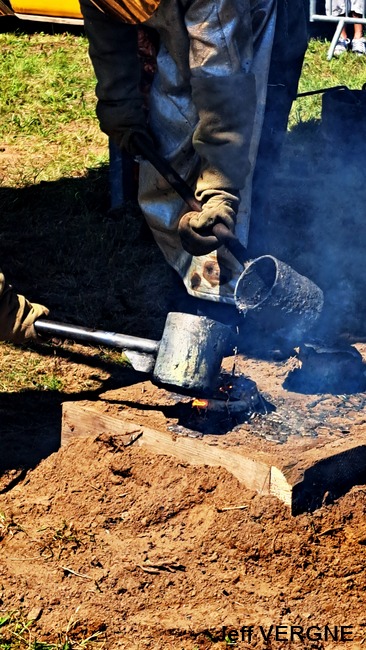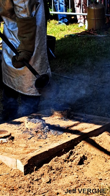 Le métal, chauffé entre de 1.100-1.200°, est transféré dans les moules à l’aide de louches ; une opération plus complexe mais également plus spectaculaire qu’un versement direct du creuset aux moules. Pour agrémenter le spectacle, l’attention et la tension, un four a décidé de faire des caprices, refuse de passer la barre des 1.000° C. Professionnels, les fondeurs en avait un de rechange, et l’on prestement remplacé.