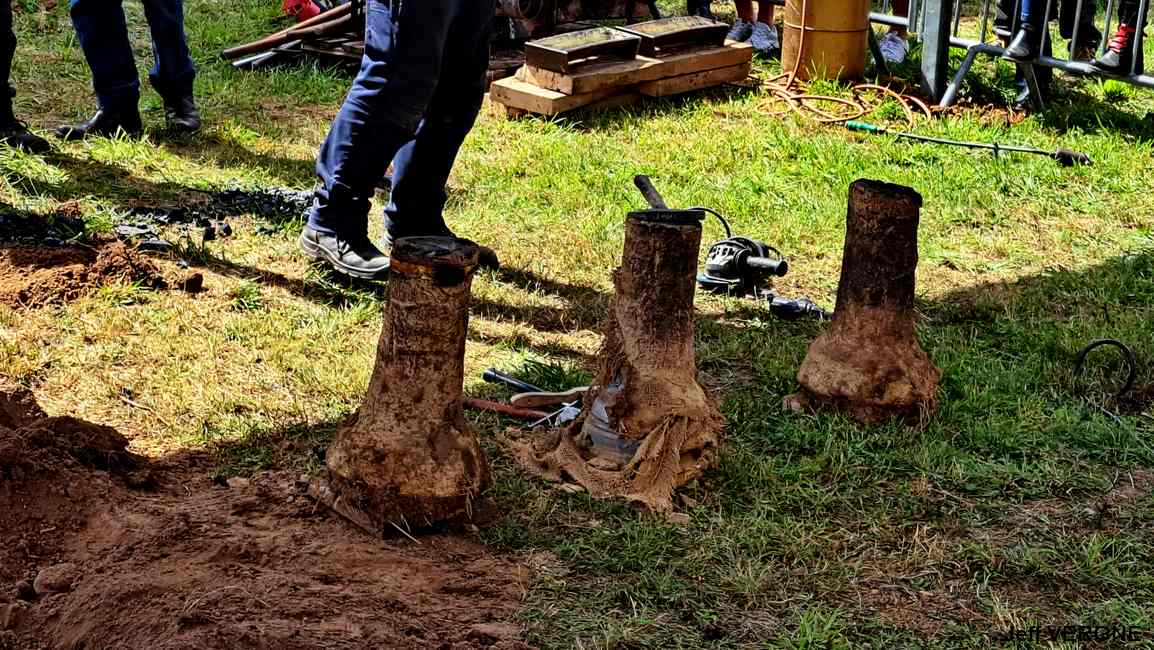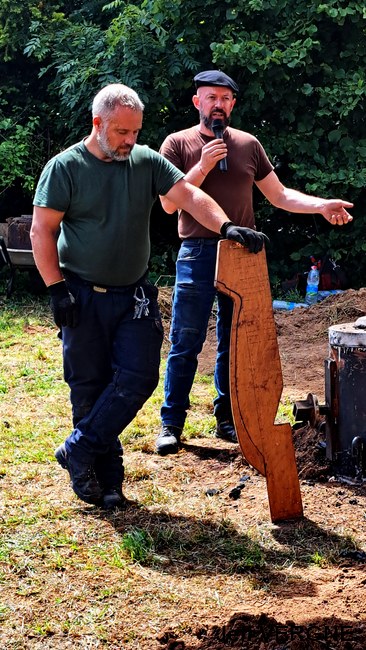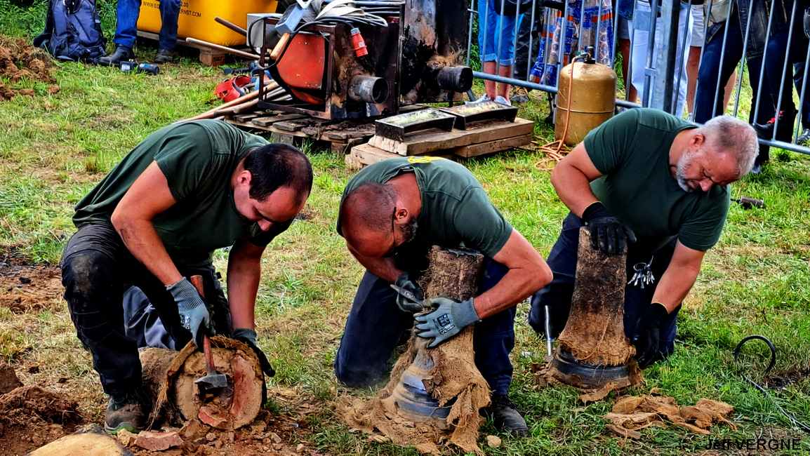 Après des agapes bien méritées, tant pour les fondeurs que pour les participants, le métal ayant refroidi près de 3 heures, les moules sont déterrés et brisés, laissant apparaitre les nouvelles roberticurtiennes. Tout au long de ces opérations, Julien dispensait explications et anecdotes, fort appréciées par l’auditoire. Toujours pour des raisons de sécurité, seul le grand four à réverbère était visitable par les spectateurs, sans oublier, entre autres, sa grue de 12 tonnes de 1847.