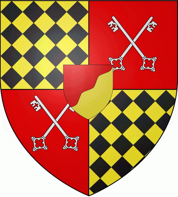 "Écartelé aux 1 et 4 losangés d'or et de sable qui est de Lignéville, aux 2 et 3 de gueules à deux clefs d'argent en sautoir qui est de Remiremont, sur le tout de gueules taillé ondé d'or."