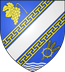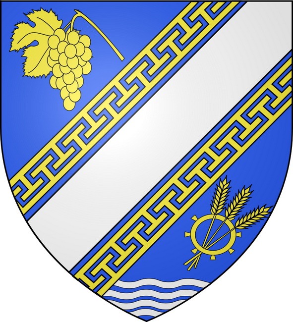 "D’azur à la barre d’argent côtoyée de deux doubles cotices potencées et contre-potencées, accompagnée, en chef, d’une grappe de raisin feuillée et, en pointe, de trois épis de blé posés en barre traversant une roue dentée, le tout d’or, aux quatre burelles ondées aussi d’argent en pointe."