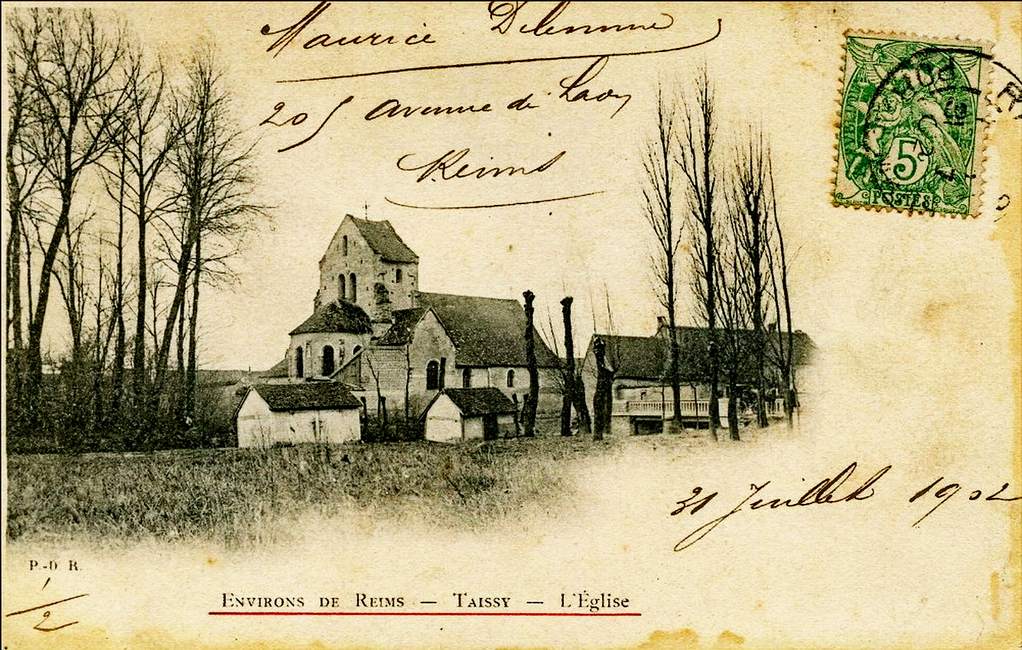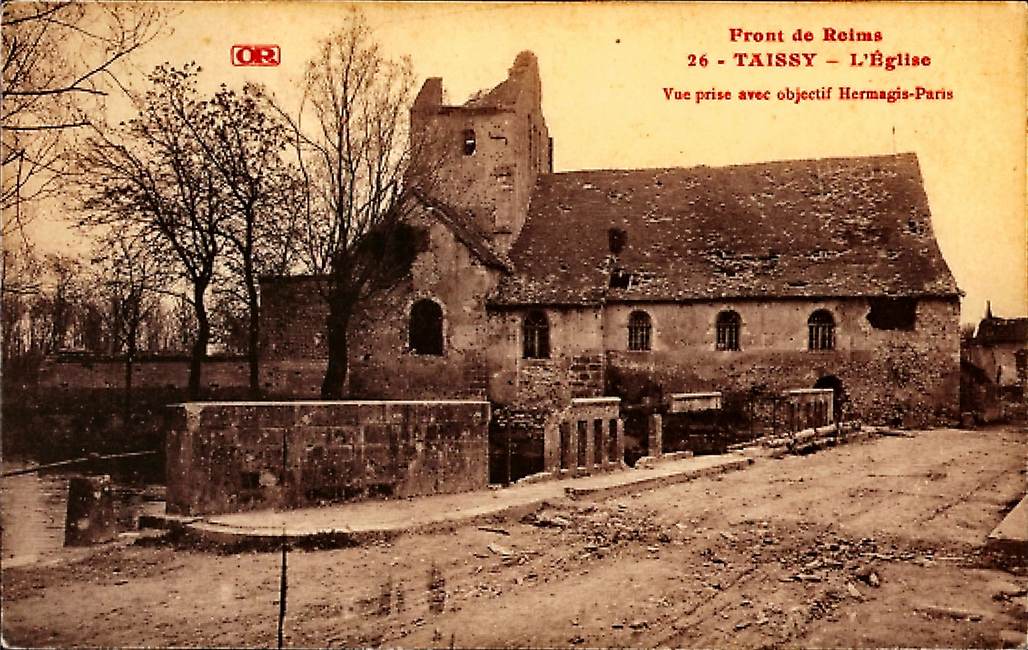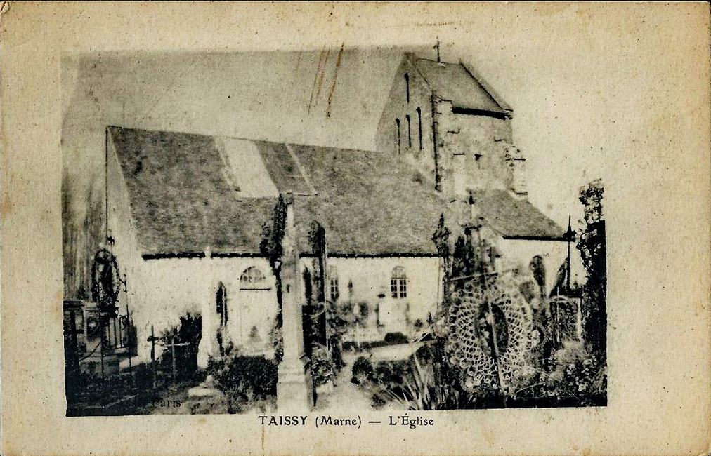Implantée en bord de la Vesle et entourée de son cimetière, l’Église Notre-Dame de Taissy, est édifiée au XII° siècle. De style roman, construite sur le plan de croix latine, sa nef à trois vaisseaux est éclairée par une série de vitraux des années 1930. Comme beaucoup d’autre bâtiments de la région, elle subit de fortes dégradations lors du 1er conflit mondial (et 2nd), son son clocher et le cœur, entres autres, sont sérieusement endommagés.