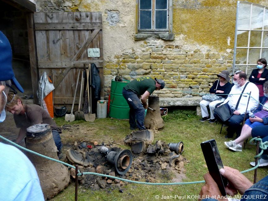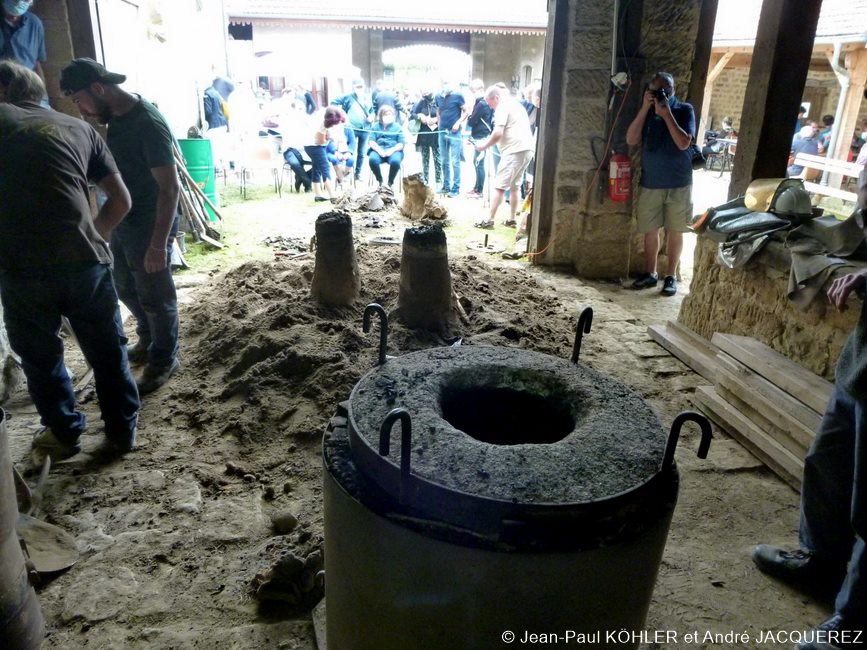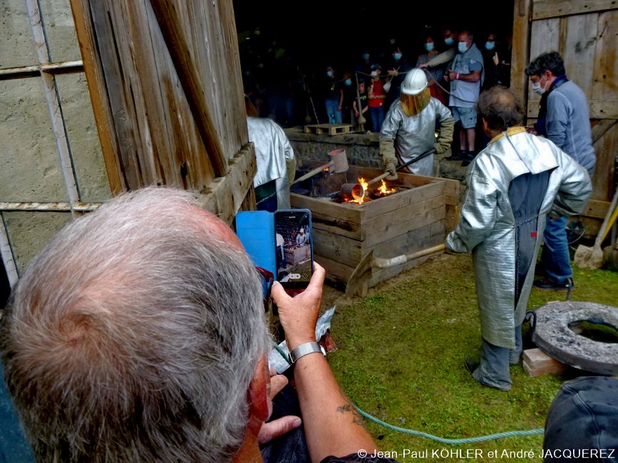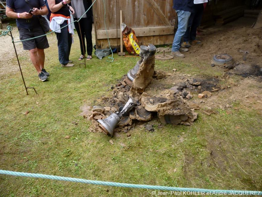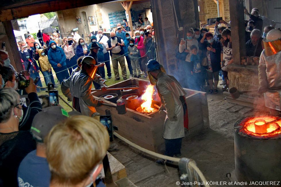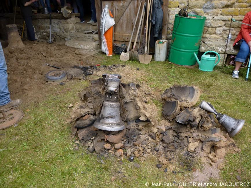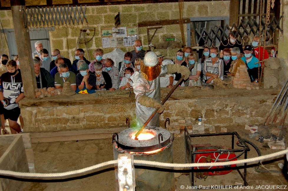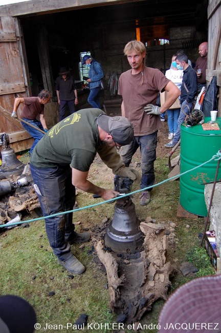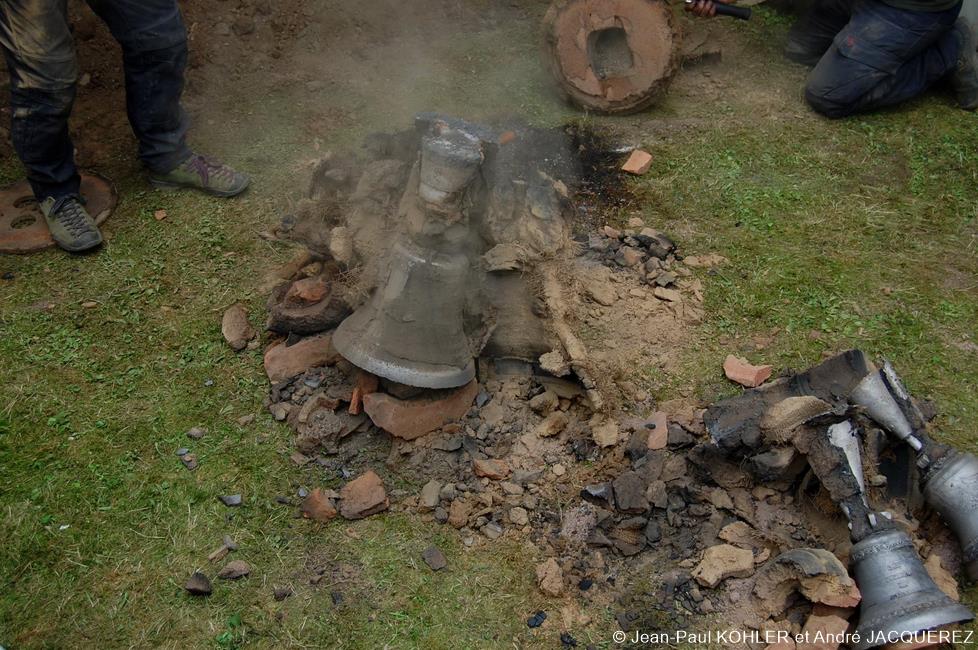 Comme en 2019, le métal est récupéré dans le creuset, à l’aide de louches, pour être versé dans les moules. Elles possèdent une contenance d’environ 12 Kg de métal en fusion, auquel il convient d’ajouter le poids du contenant. La coulée donne naissance à des cloches de 5, 8, 17, 22 kg et la dernière de 40 kg. Il s’agit de commandes des visiteurs ou sympathisants de la fonderie de Robécourt. Les nouvelles roberticurtiennes sont démoulées en milieu d’après-midi, après avoir refroidies environ 3-4 heures. Le soir, elles sont emportées à Strasbourg, pour les différentes finitions et la pose du battant.