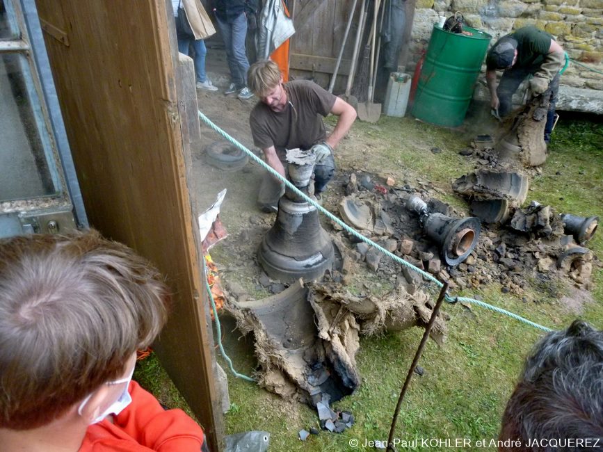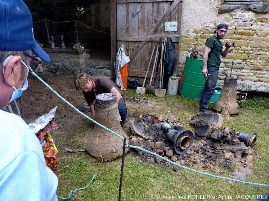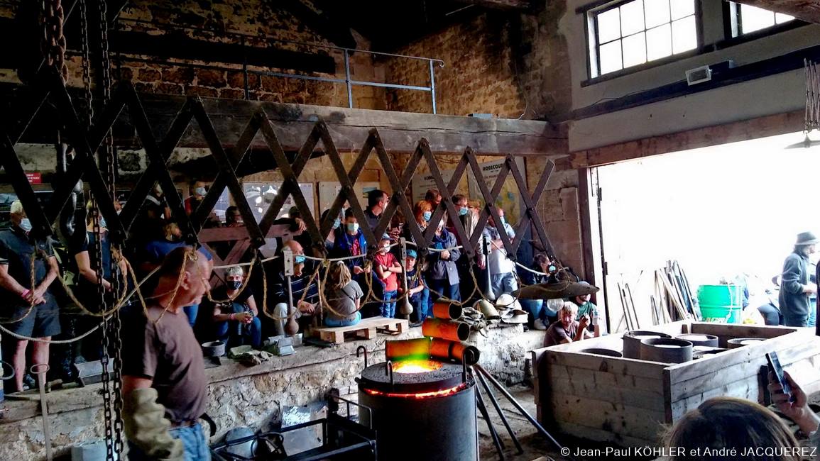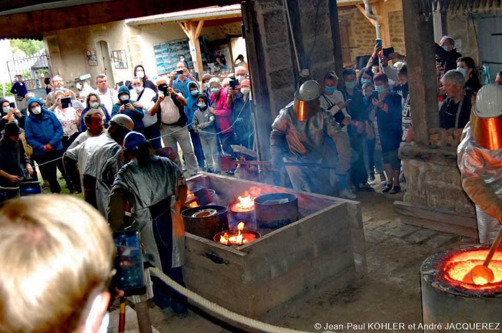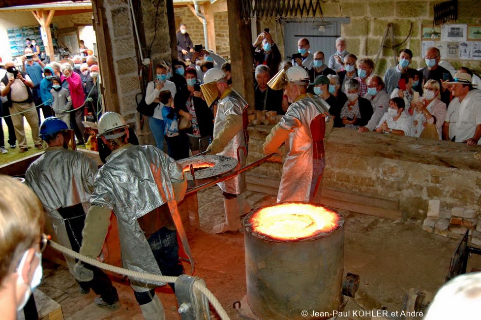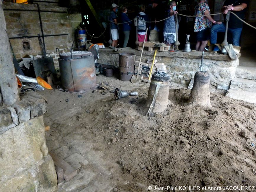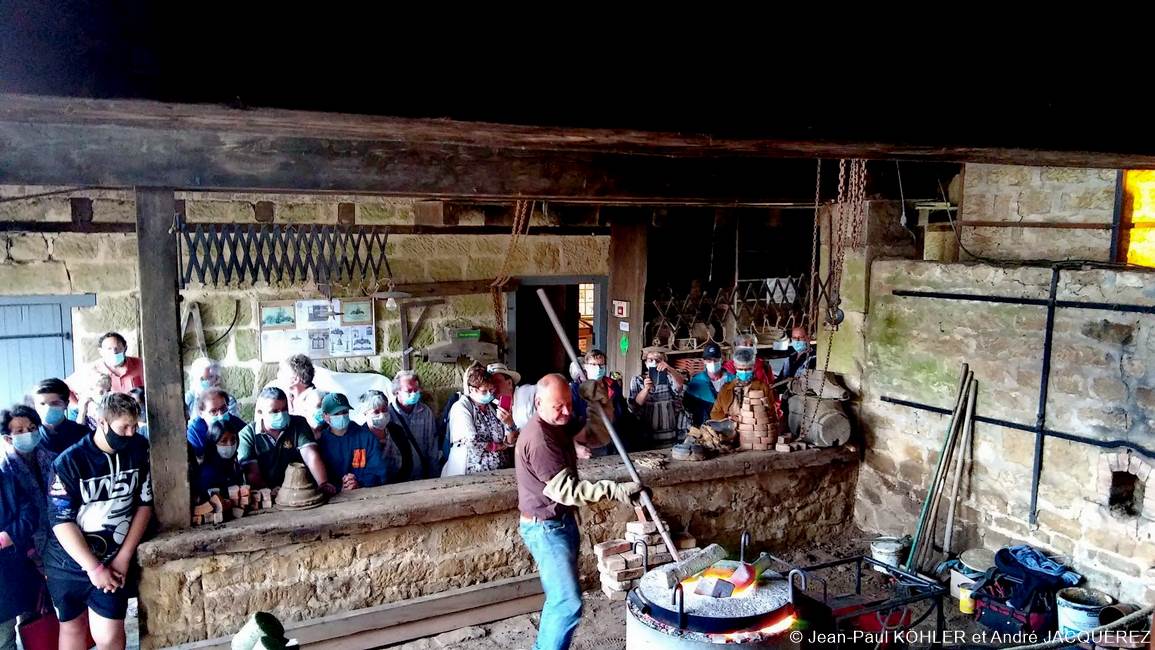 Comme en 2019, le métal est récupéré dans le creuset, à l’aide de louches, pour être versé dans les moules. Elles possèdent une contenance d’environ 12 Kg de métal en fusion, auquel il convient d’ajouter le poids du contenant. La coulée donne naissance à des cloches de 5, 8, 17, 22 kg et la dernière de 40 kg. Il s’agit de commandes des visiteurs ou sympathisants de la fonderie de Robécourt. Les nouvelles roberticurtiennes sont démoulées en milieu d’après-midi, après avoir refroidies environ 3-4 heures. Le soir, elles sont emportées à Strasbourg, pour les différentes finitions et la pose du battant.