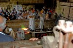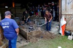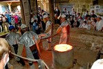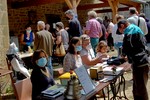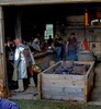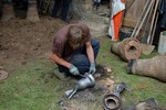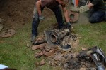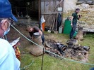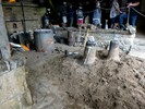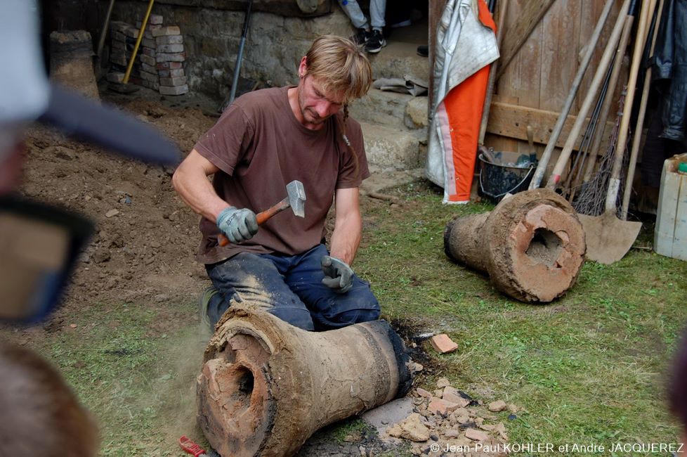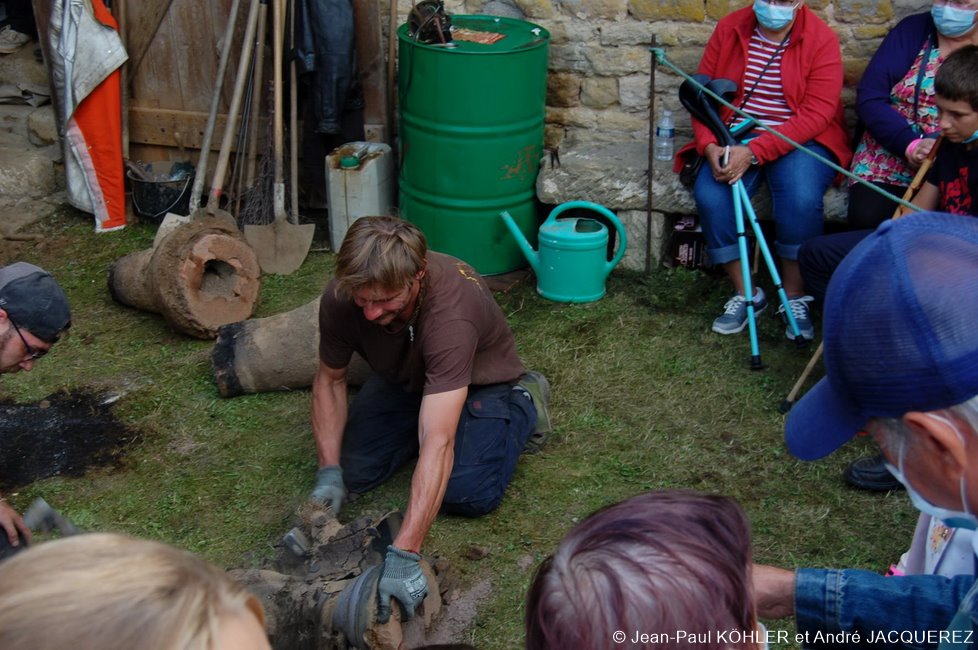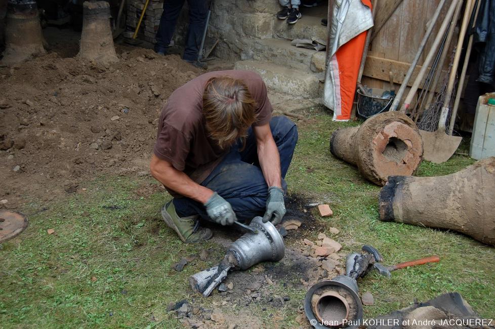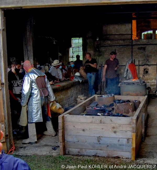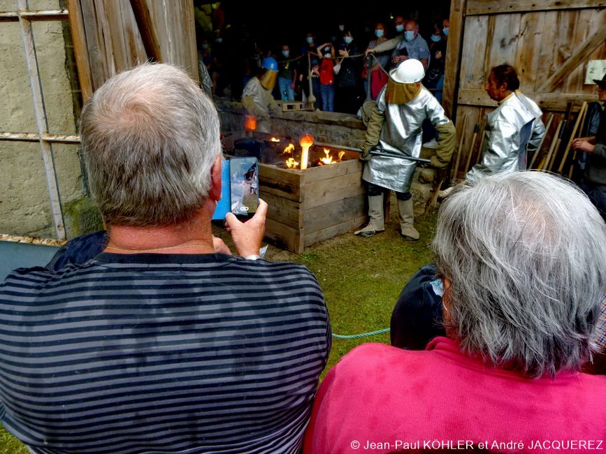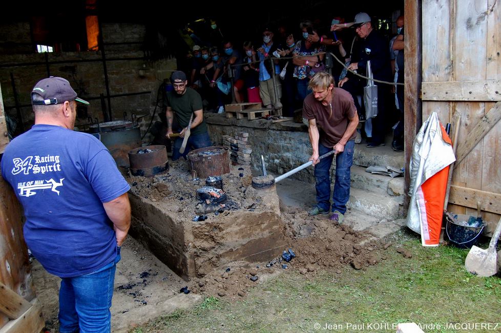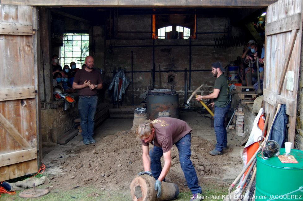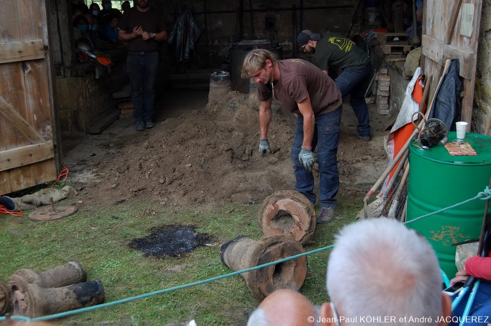 Comme en 2019, le métal est récupéré dans le creuset, à l’aide de louches, pour être versé dans les moules. Elles possèdent une contenance d’environ 12 Kg de métal en fusion, auquel il convient d’ajouter le poids du contenant. La coulée donne naissance à des cloches de 5, 8, 17, 22 kg et la dernière de 40 kg. Il s’agit de commandes des visiteurs ou sympathisants de la fonderie de Robécourt. Les nouvelles roberticurtiennes sont démoulées en milieu d’après-midi, après avoir refroidies environ 3-4 heures. Le soir, elles sont emportées à Strasbourg, pour les différentes finitions et la pose du battant.