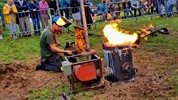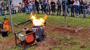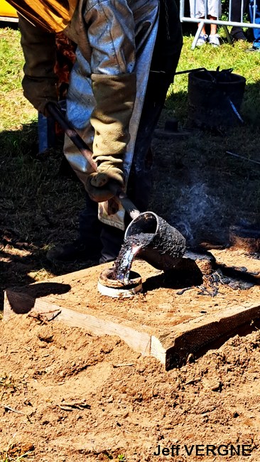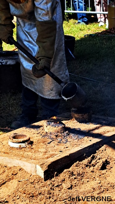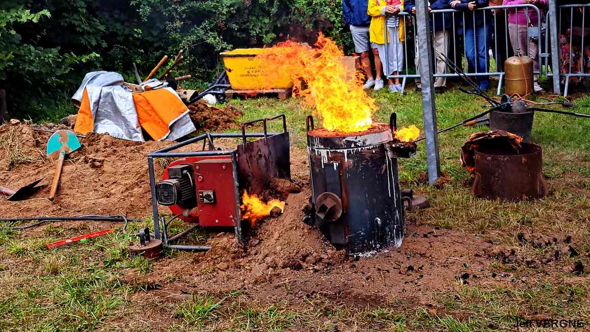 Le métal, chauffé entre de 1.100-1.200°, est transféré dans les moules à l’aide de louches ; une opération plus complexe mais également plus spectaculaire qu’un versement direct du creuset aux moules. Pour agrémenter le spectacle, l’attention et la tension, un four a décidé de faire des caprices, refuse de passer la barre des 1.000° C. Professionnels, les fondeurs en avait un de rechange, et l’on prestement remplacé.
