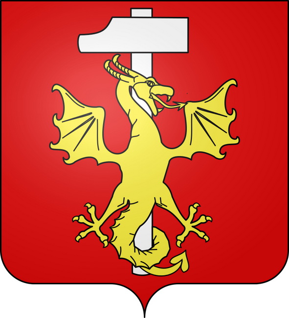 "De gueules au marteau contourné d'argent posé en pal, chargé d'un dragon contourné d'or, les ailes éployées, la queue tortillée autour du manche du marteau, crachant des flammes du champ."