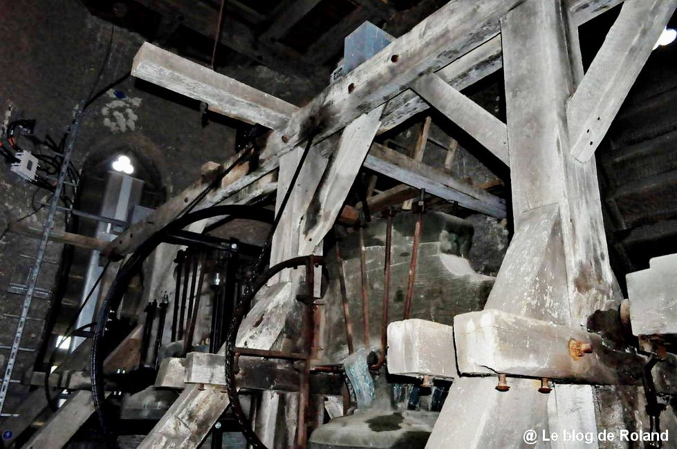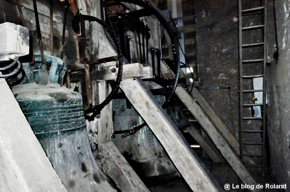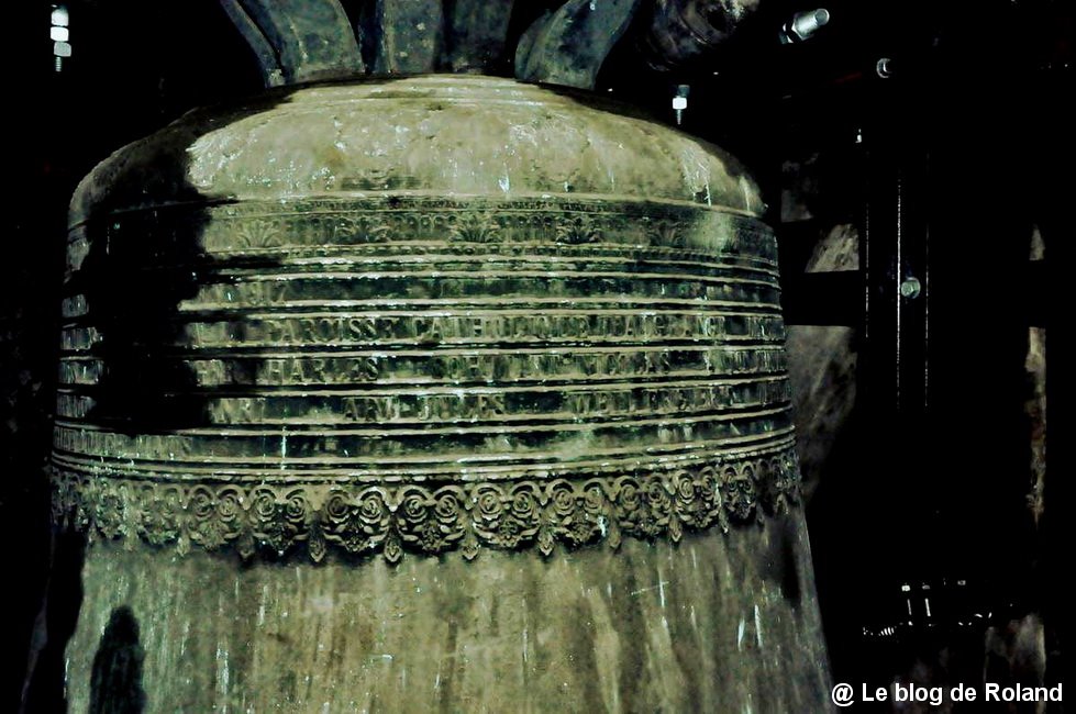 Aperçu des 4 cloches de l’église ; gros plan sur Marie-Rose, seule rescapée de la réquisition allemande de 1944