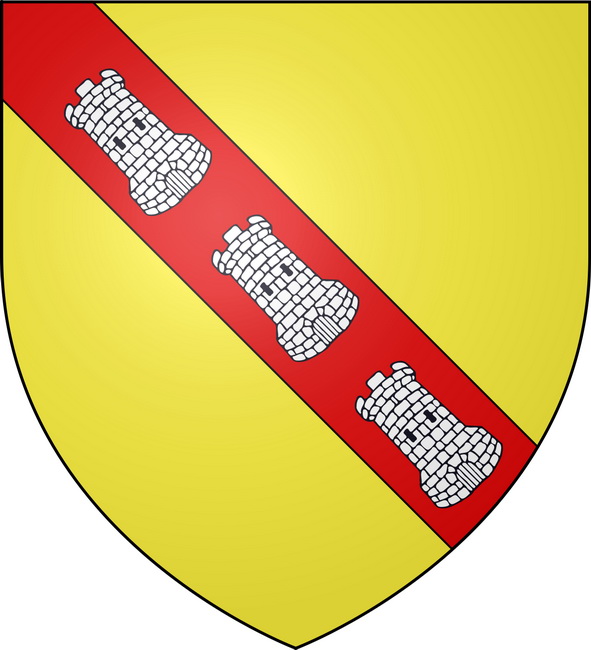 "D'or à la bande de gueules chargée de trois tours d'argent."