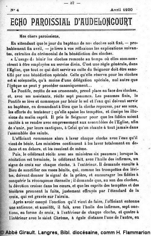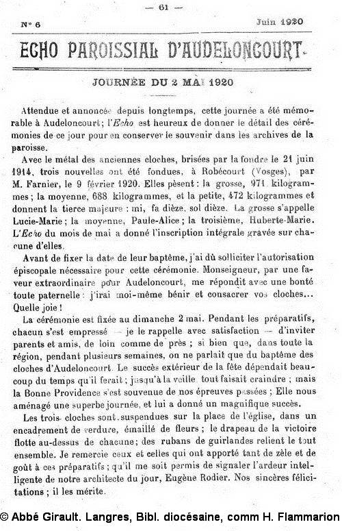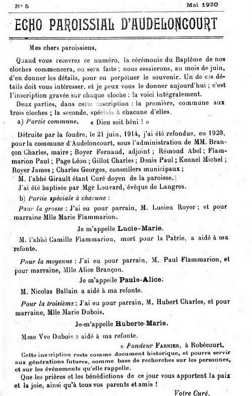 L'Écho paroissial d'Audeloncourt. Mois d'Avril 1920 à Juin 1920.